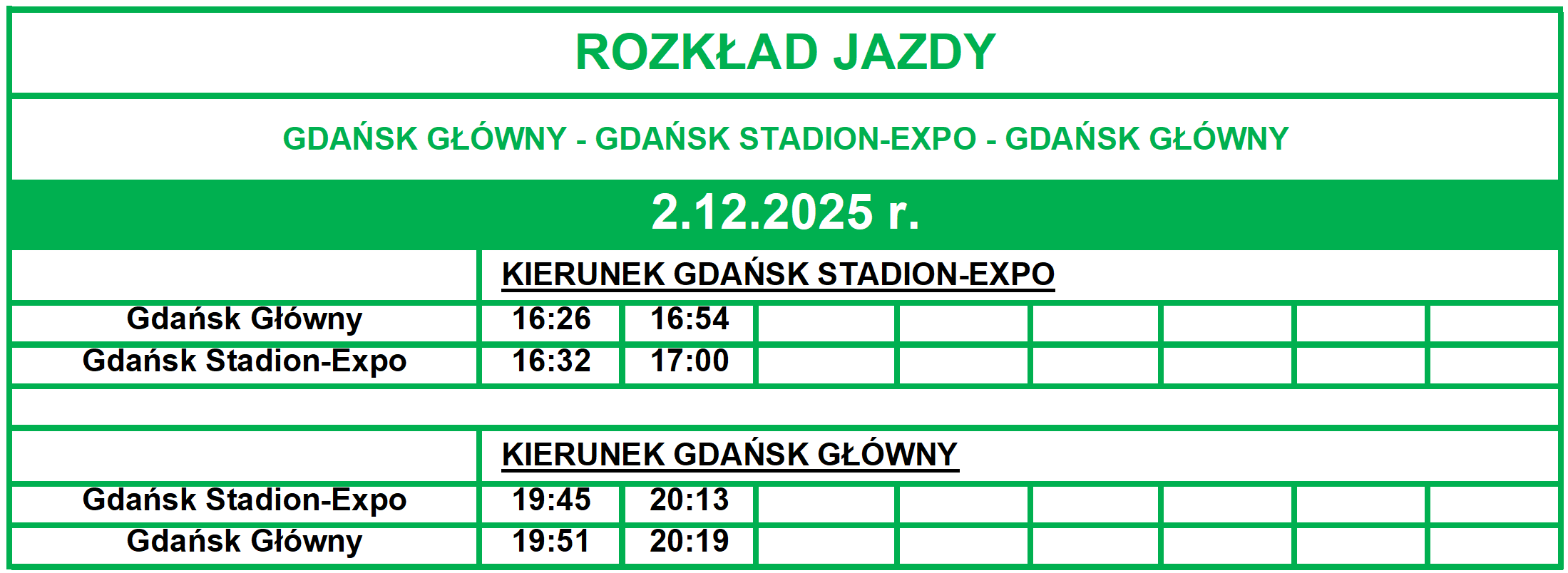 Informujemy, że w dniu 2.12.2025 r. (wtorek) w związku z meczem Lechia Gdańsk - Górnik Zabrze rozpoczynającym się o godzinie 17:30 na Stadionie Polsat Plus Gdańsk na odcinku Gdańsk Główny - Gdańsk Stadion-Expo - Gdańsk Główny zostaną uruchomione pociągi.