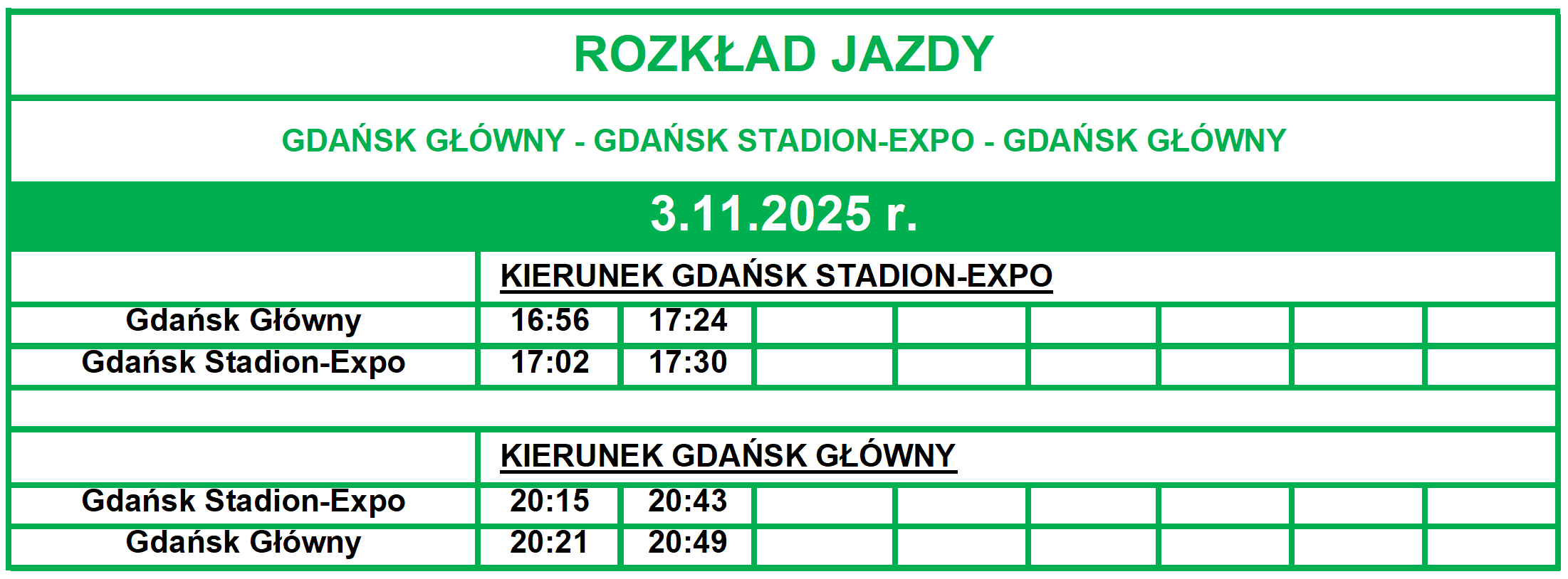 Informujemy, że w dniu 3.11.2025 r. (poniedziałek) w związku z meczem Lechia Gdańsk - Radomiak Radom rozpoczynającym się o godzinie 18:00 na Stadionie Polsat Plus Gdańsk na odcinku Gdańsk Główny - Gdańsk Stadion-Expo - Gdańsk Główny zostaną uruchomione pociągi.